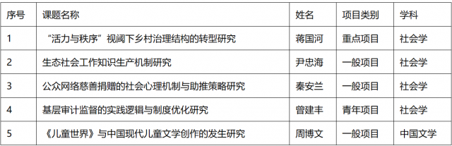 此次学院国家社科基金项目立项无论是从“质”还是从“量”方面均取得历史性突破。其中社会学系获得资助项目4项,蒋国河教授获批的项目为社会学系首个重点项目,实现了重点项目零的突破。而学院5个项目立项也继去年取得佳绩后再创立项数量新高。