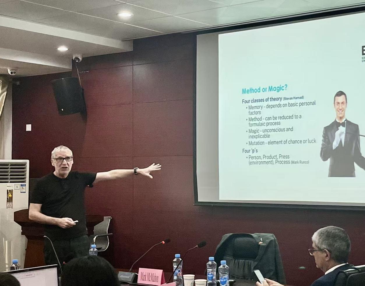 During the exchange event, Professor Mark McMahon, a core member of the Edith Cowan University delegation and Director of International Strategy at the university’s and the faculty of School of Arts and Humanities, delivered a keynote address titled “Innovation in the Age of AI.” He provided an in-depth analysis of artificial intelligence’s impact on the creative industries and education sector. He emphasized that AI has evolved from a “future concept” into a “present-day tool.” In creative fields, AI does not replace human creativity but enhances the creative process through human-machine collaboration—for instance, leveraging cutting-edge AI tools to boost creative efficiency and expand creative boundaries. He further stressed that uniquely human qualities such as empathy, intuition, and imagination remain irreplaceable core competencies. This perspective resonated strongly with JUFE the School of Sociology and Humanities’ goal of “cultivating talents with both humanistic literacy and innovative capabilities,” sparking lively discussions among faculty and students in attendance.